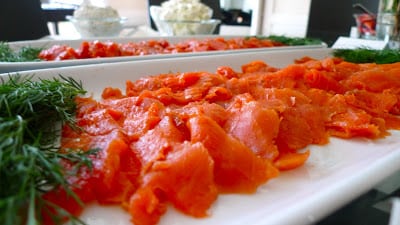 One thing I don’t miss about living in NYC is Sunday brunch. I always felt like I wasted the day on mediocre eggs benedicts and cheap mimosas. But sitting here I wonder why I despised those brunches so much. After all, I’ve never met a menu I didn’t want to order from and, while I don’t love aggressive day drinking, I can’t say I mind a little midday buzz. So what is it? I realize, I love to be at home on a Sunday! Plus, I can never decide between sweet or savory on a brunch menu; I want a bit of eggs and to end with maple syrup drenched pancakes. Hence, brunch is the most important meal to host at home! So that’s what we did this Sunday. And truly, if if I had to pare this menu down, all you need for a perfect brunch: bagels, cream cheese, gravlax and accoutrements, fresh fruit and sticky buns. And while store-bought gravlax or lox does the trick, homemade couldn’t be simpler. Take a 2 1/2-3 pound salmon fillet, cover with 1/4 C. sugar and 1/4 C. salt and scatter a bunch of dill on top. Wrap it all up with plastic wrap, place in fridge, cover with a few cans and flip it over every day for 3-4 days. Voila, you’ve made gravlax. Sometimes I use brown sugar, salt, 1 T. paprika and 1 T. coriander for ‘pastrami’ gravlax. This also makes a great hors d’oeuvres on pumpernickel with a little creme fraiche or mustard sauce with dill. And people are always impressed with the house curing!