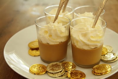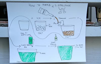 Gathering a group of friends for ‘off’ holidays seems to be my and Greg’s new tradition: President’s Day, Oktoberfest, and now St. Patrick’s Day. There is something inherently festive about these parties (not that St. Patrick’s Day needs any help in the festive department). With a built in theme of all that is green and Irish, there is nothing to fret over with a St. Patrick’s Day party. After all, is there really any reason to mess around with as good of a thing as corned beef and cabbage? Throw in some potatoes and spring carrots and call it a day. And while serving Guinness is a perfectly suitable beverage for such an affair, Greg upped the anti by creating a signature drink: “The Leprechaun.” He showed off his drawing skills with a visual aid for guests to follow his recipe and make their own drinks (no one should have to play bartender at their own party). The result was a tasty concoction of Jameson, shamrocks (for real!), cucumber and lime, topped off with a splash Harp. And after years of experimenting with St. Paddy’s Day desserts (e.g. Lucky Charms treats, chocolate stout cake, Guinness ice cream & beer floats), I’ve landed upon a new tradition: little pots of gold in the form of butterscotch pots de creme (topped with whipped cream and edible gold, of course). Hope everyone recovered well from the Irish antics: Slainte!!