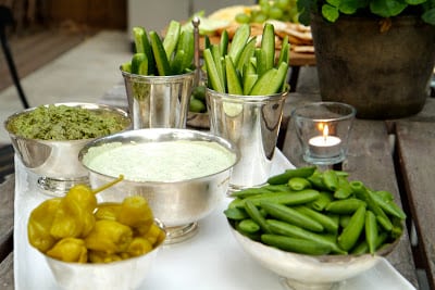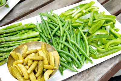 green crudités: snap peas, cucumbers, green peppers, asparagus, green beans, cornichons & olives