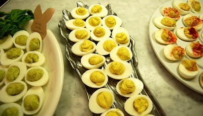 Devilled eggs three ways: basil, curried and spicy paprkia