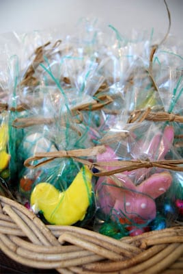 Our favors: mini Easter baskets with homemade sugar cookies and candy to go