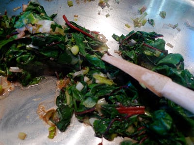 Chop and clean 3 leeks. Soften over medium heat in 2 T. butter or olive oil. In the meantime, clean 2-3 cups of swiss chard and cut into 1/2” strips. Once the leeks are soft, add the chard and cook until wilted, about 2 minutes. Let cool a bit. In another bowl mix 2 eggs, 1/4 C. whole wheat flour, salt and pepper. Once chard mixture has cooled, add to eggs and flour. Drop into cast-iron pan and spread 2” wide, 1/2” thick. Cook like pancakes and serve with a dollop of creme fraiche.