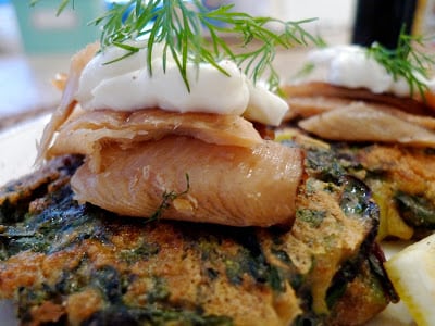 Farm to table may be all the rage, but I’m pretty into lake to table. Out on Clear Lake, as my family struggled through the emotional turmoil of being confined to a row boat, we were rewarded with catching our limits of jumping trout. We had enough of the fresh, flaky little guys to feed a house full of guests and the trout that my Aunt Di smoked were my favorite. I put the smoked trout on swiss chard cakes–a method my friend Erin taught me–and these cakes, which can be made with whatever vegetables are around, are the best go-to dinner. Topped with poached eggs, or simply served along mixed greens, they are my solution to ‘I have nothing to eat’. See the method below because they really are amazing…thanks Erin!