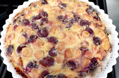 Berry season is upon us which means pies, crumbles, crisps and cobblers. I opted to make an cherry clafoutis for the annual Gonfard Family Memorial Day BBQ. I love this eggy, custardy dessert and it’s a great alternative to the more time consuming pie. However, if one of your hosts happens to be French (Mr. Gonfard) and you feel especially ashamed about the lack of French you learned during your semester abroad in Paris (me), then you should practice how to pronounce clafoutis before you present dessert!