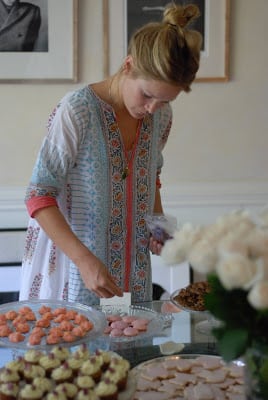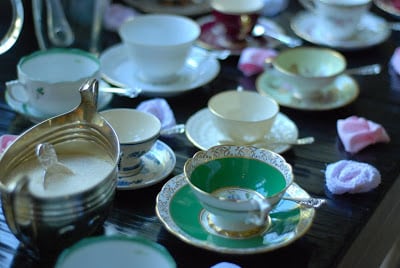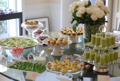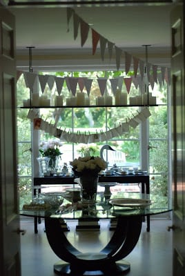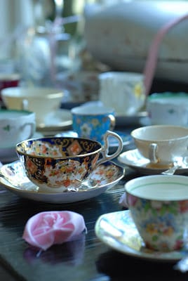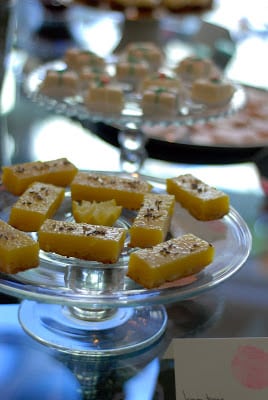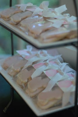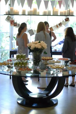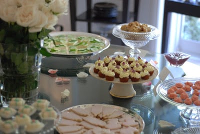 During college I spent a rainy month in London. Without a real purpose for being there, I aimlessly strolled through museums, read The Bell Jar in Hyde Park, saw American Psycho in a fancy movie theatre and as many West End shows as I could. But despite the great surroundings, I was lonely, lost. I found great comfort in the ritual of the afternoon tea. Who couldn’t be charmed by dainty finger sandwiches, crumbly scones with globs of clotted cream and fresh raspberry jam, flecked with seeds? It was heaven. Those delightful afternoons were my inspiration for this weekend’s baby shower. All of the nibbles and treats were artfully displayed on tiers of crystal and floral cake stands. Amy embraced shades of pink and lady-like floral and ribbon touches to celebrate the near arrival of Frannie’s little girl. Guests brought baby photos of themselves, which Amy displayed above the assorted teacups and everyone filled their ballots with their matching guesses. All in all, a proper and lovely afternoon tea.