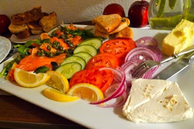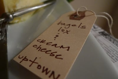 bagels, lox, cream cheese, tomatoes, capers, onions