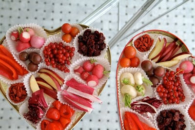 pink & red crudités: radishes, currants, goji berries, red peppers, sweet peppers, cherry tomatoes, dried cherries, red delicious apples, red carrots & radicchio