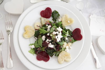 salad of artichoke hearts, hearts of palm, heart beets, heart croutons and baby kale with a pink peppercorn champagne vinaigrette