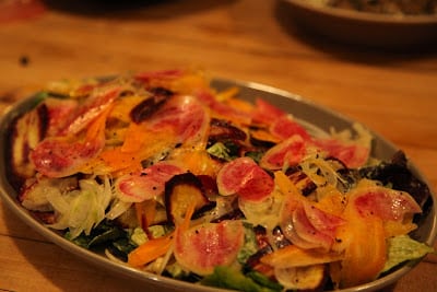 shaved spring vegetable salad of watermelon radishes, baby carrots, fennel & garden lettuces with a green goddess dressing