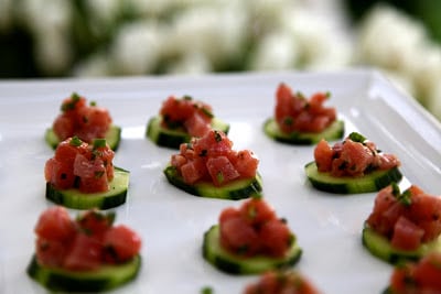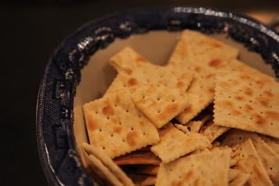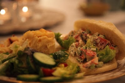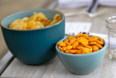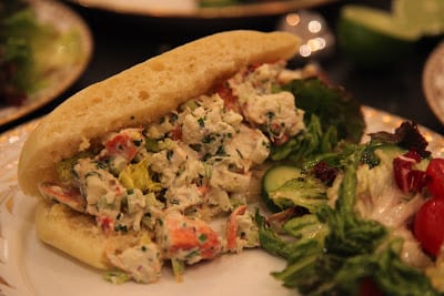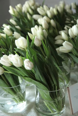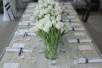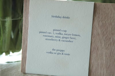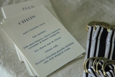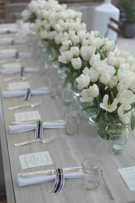 While in college, my friend Deirdre befriended an older gentleman who invited us out to his home in the Hamptons. This all felt very glamorous, very grown-up and very fun. After an ‘interesting’ weekend, the group of house guests went out for a farewell brunch before catching the jitney back into the city. It was then that I discovered a lobster roll. Heaven (especially when paired with a much needed bloody mary). The lobster roll represents all of the East Coast vacations I’m longing to take: Martha’s Vineyard, Cape Cod and Maine. But I have made it the Hamptons and was not disappointed with the food. For this preppy themed birthday party, I recalled the flavors of that trip and all things seaside & nautical. When in doubt, put out goldfish crackers and salt & vinegar potato chips with cocktails. People love them–how could they not? Fish chowder at home? A really easy, decadent treat. And for a homemade lobster roll, my trick is lots of fresh tarragon and real mayonnaise (a homemade brioche bun doesn’t hurt). Amy set the table and really knocked it out of the park with these handmade preppy ribbon belt napkin holders. I died for them. Sticking with stark white and navy made a pleasing impact; all white tulips, crammed together in Amy’s signature style, looked gorgeous down the long table. This menu is one that I’m sure to repeat this summer and I swiped Amy’s napkin holders and look forward to using them again and again…