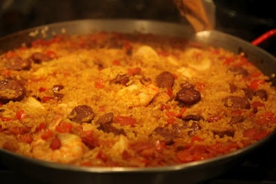 seafood paella with mussels, clams, scallops, shrimp & chorizo