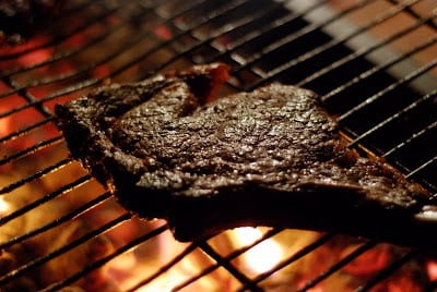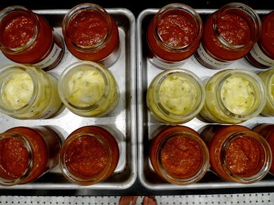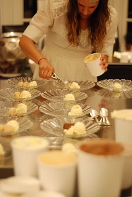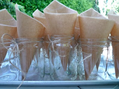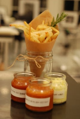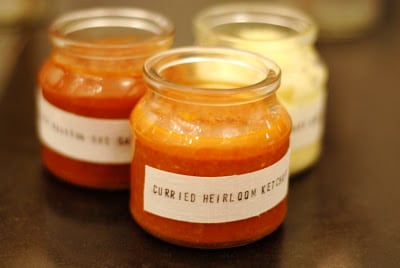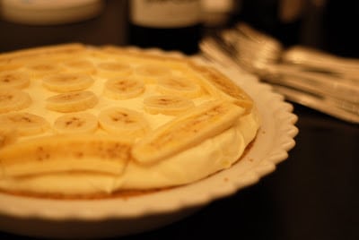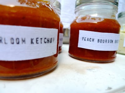 A classic American steak house dinner with house-made condiments and all the fries you can eat! We rented a commercial fryer, along with a six foot commercial grill, and the two provided a restaurant quality meal with all of the perks of our cozy patio. It is worth noting that people just love shrimp cocktail. They can’t get enough. I like to roast jumbo shrimp and serve them hot: crowd pleaser. Plus, the meal was made extra special with my latest discovery: bruised fruit deals at the farmer’s market! Barely squashed heirloom tomatoes, for eighty cents a pound, yielded fresh curried ketchup, and soon-to-be-tossed peaches became a peach bourbon bbq sauce. These, in addition to a rosemary aioli, were lovely dates for our fries. Amy and I (both huge lovers of condiments and dips) loaded them all into jars, which she labeled, and each guest got their own set…sort of like heaven. Greg was the master fryer and fries kept a coming, packaged in parchment cones that Amy (show off that she is) neatly sewed. The rib-eyes, creamed spinach and wild mushrooms all became somewhat of afterthoughts to those piping hot fries! Rounding out the dinner, banana cream pie, inspired by my friend Deirdre. On her suggestion, I made Magnolia Bakery’s banana pudding as the filling for my vanilla wafer pie crust: perfection (and I didn’t even know I liked banana cream pie!) For her musings on the recipe, click here.