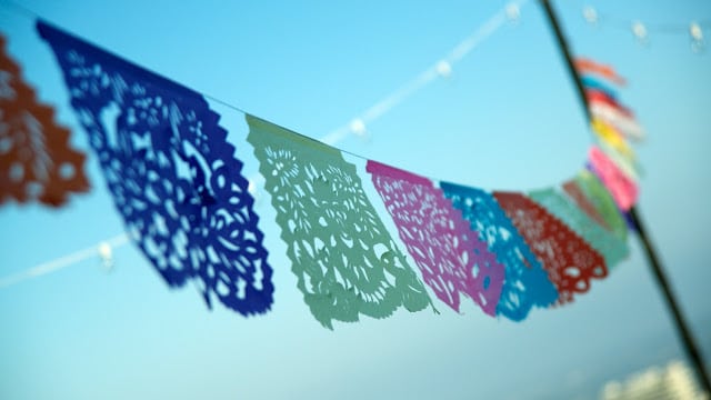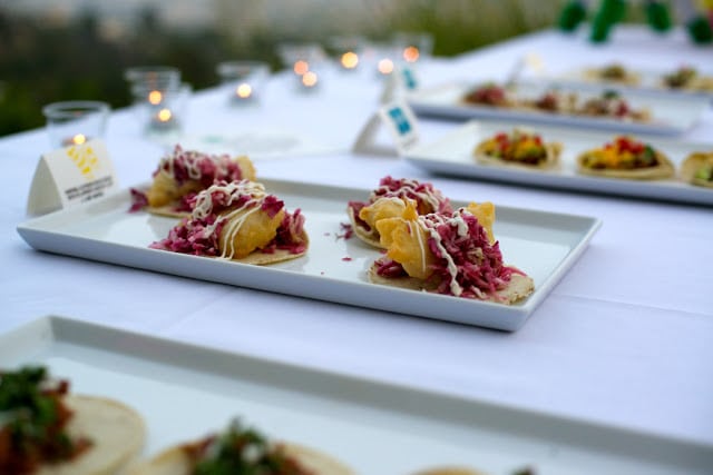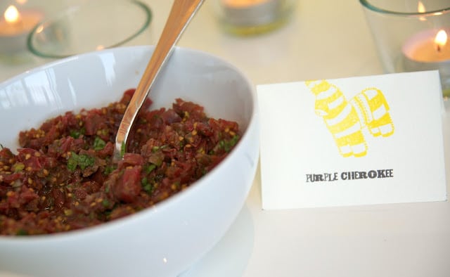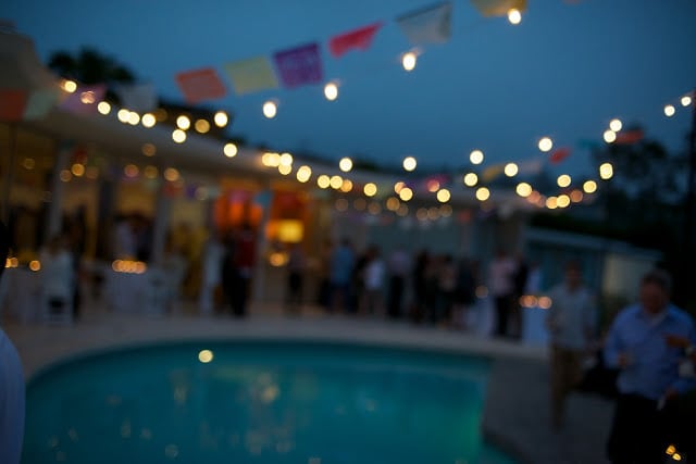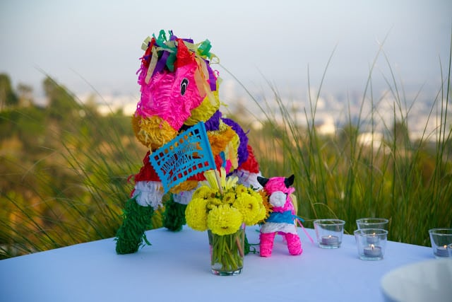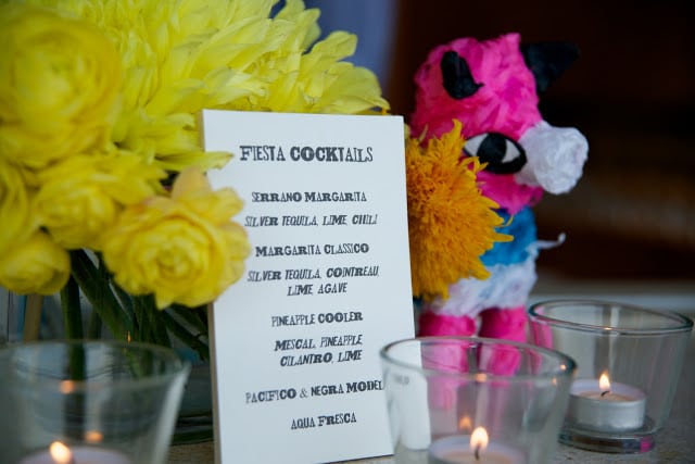 The best food for a rager is Mexican. Fact. Specifically, a taco bar. I’ll admit to giving it a bad rap with a ‘been there, done that’ attitude. Not to mention the difficulty of competing with the amazing authentic tacos LA has to offer, like from Guisados in Boyle Heights. All that aside, when good cocktails are flowing, (and they were, in the form of spicy margaritas and smoky mescal pineapple coolers) a juicy taco is the perfect snack. While I’m a lover of fish tacos, the stars of the night were the “Mama’s Tacos”. After all, who isn’t instantly taken back to childhood with a bite of seasoned ground beef, sharp cheddar, shredded lettuce and tomato (the pickle is a new, and delicious! touch). The bright colors of a Mexican banner are also instantly fun and Amy made the whole night more festive with pinatas galore, hanging flags, touches of turquoise, and yellow flowers. And just in case they weren’t ready for the night to end, guests went home with favors filled with Greg’s serrano chili margarita mix, beautifully packaged by Amy with recipe labels. I’ve learned my lesson: a taco party isn’t boring. It’s a classic.