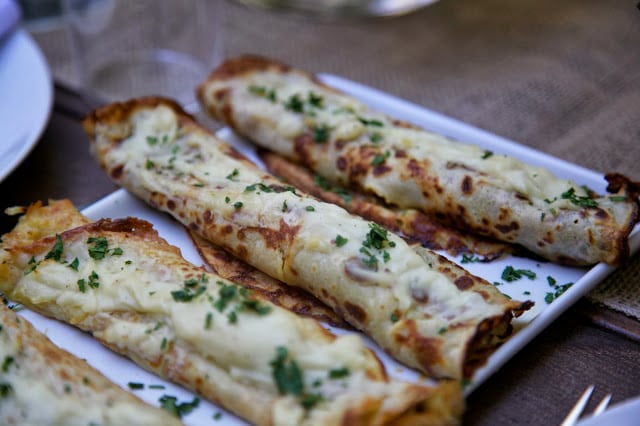 ham & cheese crepes with bechamel & chives
